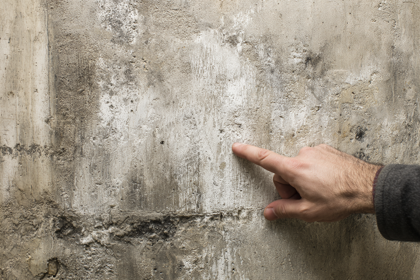 - Efflorescence (a white, powdery residue) on basement walls